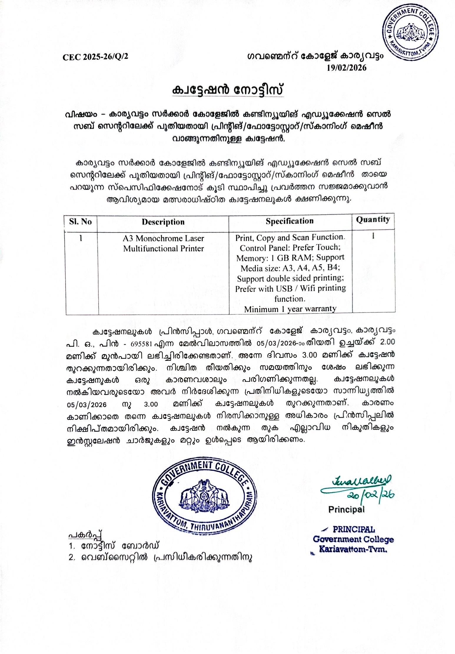 Quotation Notice for Printing/Photostat/Scanning Machine Government College Kariavattom Continuing Education Cell invites quotation for Printing/ Photostat/ Scanning Machine.[Pdf]